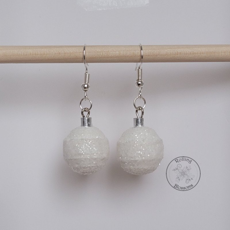 Quilled Snowball drop earrings with a glitter finish. These earrings measure about 3/4" tall.