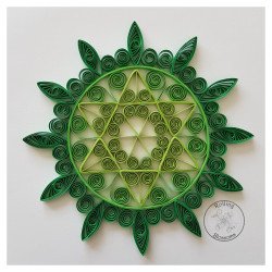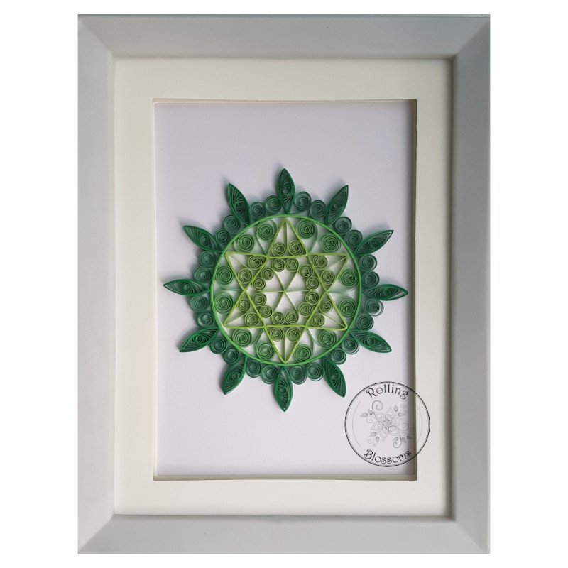 Quilled Anahata chakra in shades of green. This design is about 4 inches in diameter and can be mounted in a black or white 9x7 frame. Please fill in your frame selection in the customization fields below.